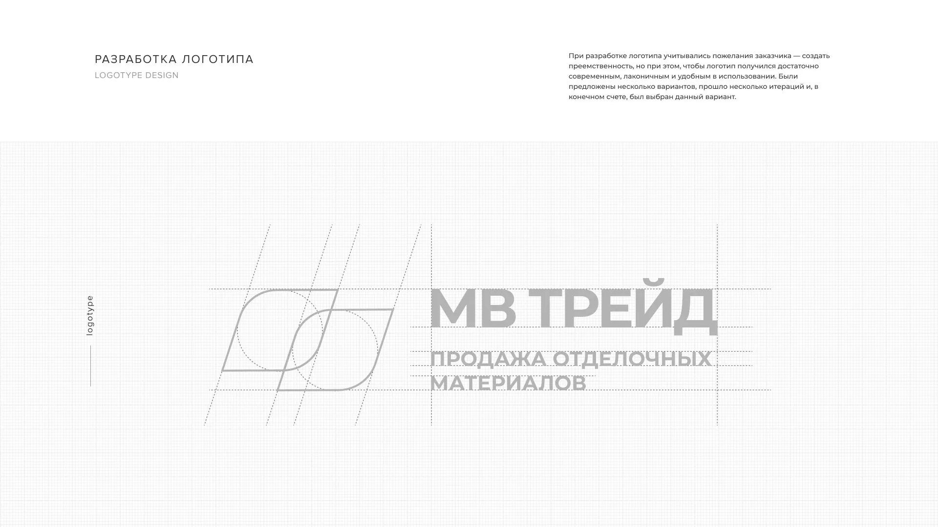 Компания «МВ Трейд» давно присутствует на рынке и успешно занимается реализацией продукции с 2003 года. Предыдущий логотип, очевидно, нужно было заменить. Наша задача — сделать фирменный знак современным, легко читаемым и удобным в дальнейшем использовании. Заказчику предложили несколько вариантов концепций и идей, в конечном счете был выбран вариант со строгим написанием и легкими графическими элементами в виде листиков, что говорит о эко-френдли компании. Также логотип отражает специфику отделочных материалов в виде стыковки панелей ПВХ, сайдинга или ламината.
