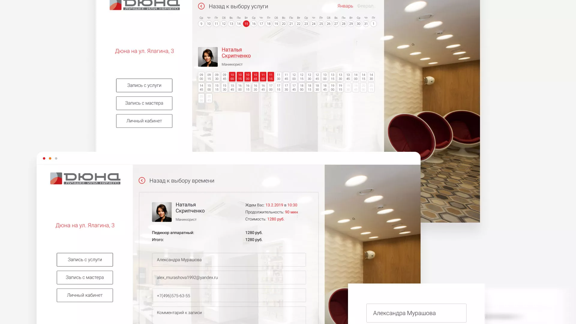 В разделе «Личный кабинет» содержатся все текущие записи в салоны красоты в Топках, с возможностью их отмены. Также, здесь можно редактировать свои персональные данные, ознакомиться с историей записей и видеть бонусы и акции салонов красоты.